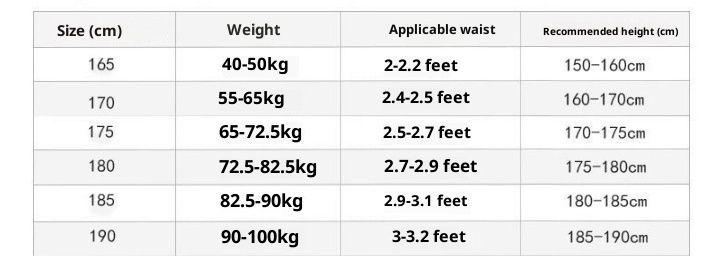 Size: 165 [47.50kg-55.00kg],170 [50.00kg-6200kg],175 [6200kg-70.00kg],180 [70.00kg-77.50kg],185 [77.50kg-87.50kg],190 [87.50kg-95.00kg]]
