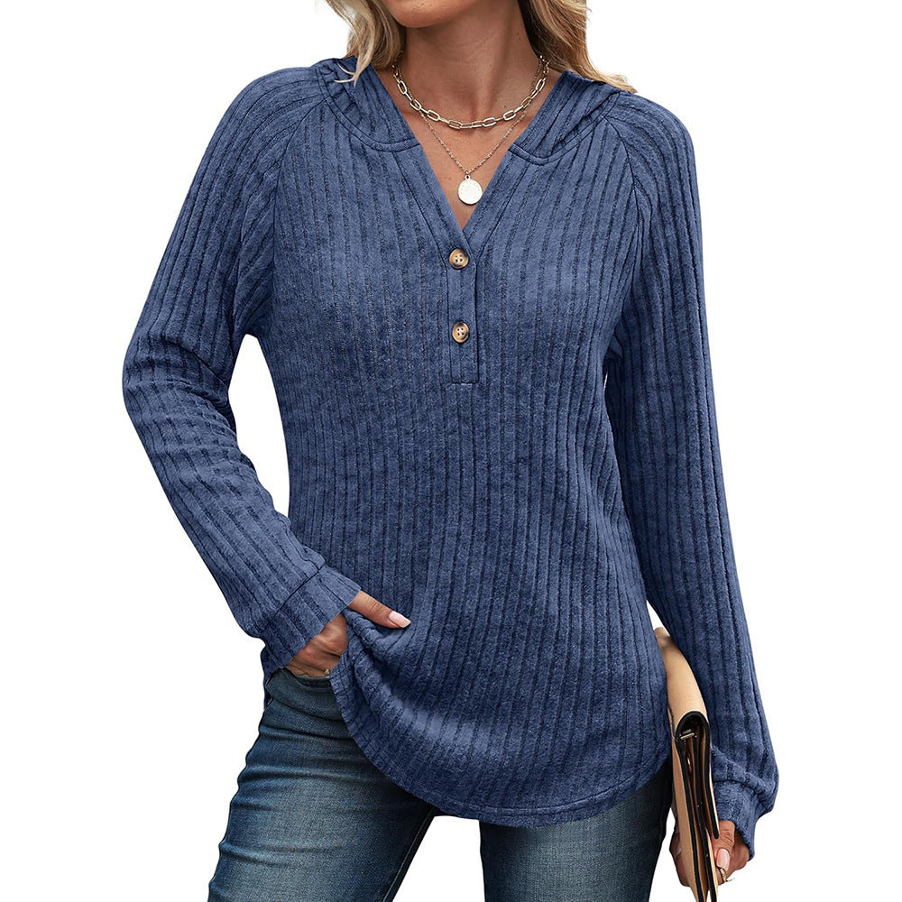 Solid Color And V-neck Button Loose Hooded Fleece Knitted Top